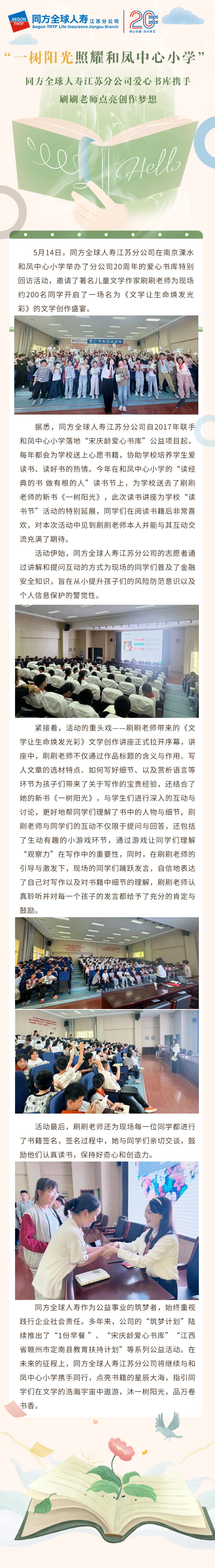 同方全球人寿江苏分公司表示,自同方全球人寿2003年成立以来,在不断扩大公司业务的同时,秉承着回馈社会的公益初心。启动了“同方全球人寿筑梦计划”, 聚焦青少年儿童的营养与健康。“爱心书库”项目将持续推进活动,不断围绕阅读开展系列活动,丰富“爱心书库”内涵,项目更加多元化,为学生们的学习继续助力!
