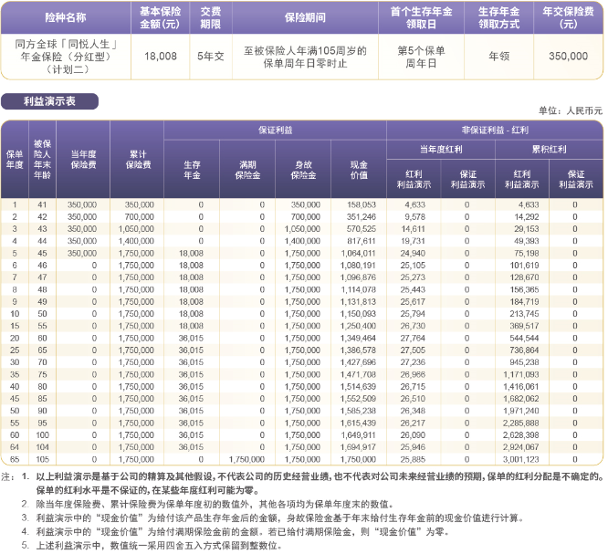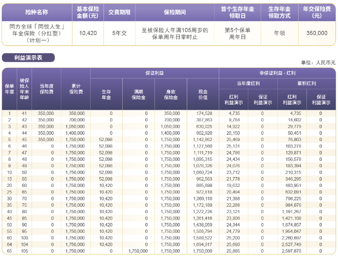 40岁的同女士重点希望为自己安排好退休后的养老生活,选择购买“同方全球「同悦人生」年金保险(分红型)”,投保时选择保障计划二,交费期限为5年,交费方式为年交,年交保费35万元,保障至被保险人年满105周岁的保单周年日零时止,首个生存年金领取日为第5个保单周年日,选择年领方式,其各保单年度的保险利益如下: