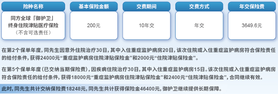 30岁的同先生为自己投保“同方全球「御护卫」终身住院津贴医疗保险”,选择10年交费,交费方式年交,保险期间终身,基本保险金额200元,投保时选择必选责任。具体的产品计划如下: