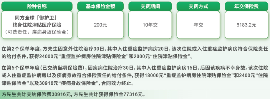30岁的方先生为自己投保“同方全球「御护卫」终身住院津贴医疗保险”,选择10年交费,交费方式年交,保险期间终身,基本保险金额200元,投保时选择必选责任以及可选责任“疾病身故保险金”。具体的产品计划如下: