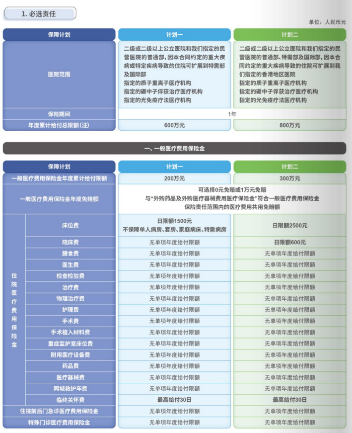 累计给付总限额随可选计划配置,提供最高可达800万元的医疗保障配置,0元或1万元两档年度免赔额随心选择,适配不同保障需求。